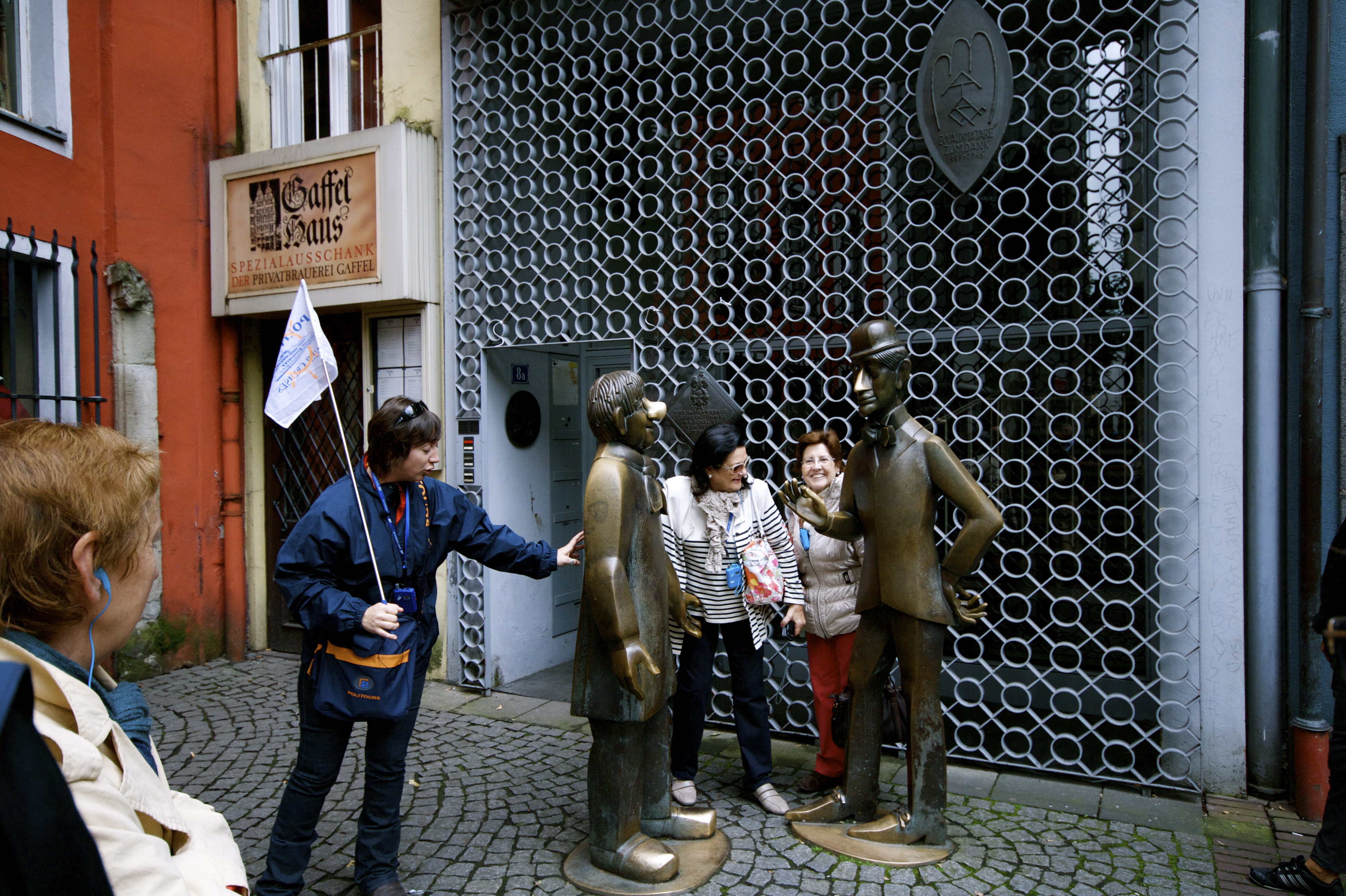 ¡ A qué se debe tanto apremio ! Ni que nos hubieran convocado a apagar un incendio: después de un vuelo a Frankfurt y un corto trayecto a Colonia en autobús, la subsiguiente cena y acomodación en el crucero, Iraxte, la guía de origen navarro, de la Navarra del Norte, desplegaba su saber en la Alter Markt, delante de las pintorescas casas del XVI – y todavía habitadas- que flanquean la espléndida iglesia de San Marteen, del rico románico renano, en una pequeña plaza, presidida por los primeros alemanes que nos salen al paso que, aunque no dicen ni mu, hay que tocarles las narices por no decir alguna obscenidad malsonante: se trata de Tünnes y Schäll, hijos del teatro cómico de Colonia, que representan a sus ciudadanos , de los cuales el primero tiene la nariz dorada de tantos besos y manoseos de los turistas, invitados como Lilith y Lapasión a frotarlas para dar cumplido a la leyenda de que trae suerte, y puedan así volver a visitar la ciudad un día.
