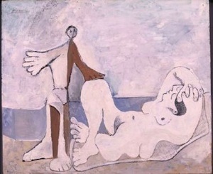 Un balcón con vistas a la naturaleza, un patio o el jardín de una casa, pone límites a la geometría de un recuadro en la interpretación del mundo exterior que su conciencia recrea; las partes de una guitarra, que la idea destroza sobre una mesa al desenfocar la perspectiva, colocándola en el mismo plano de la guitarra; la mujer modelo, su mujer, Jacqueline Roque o cualquier otra, a las que el ojo del artista la saca del corsé del buen gusto para transformarla en arte, en creación artística….a cuyo cuerpo le descuartiza el alma el ojo del artista mirón, cuya voluptuosa inclinación a resaltar la geometría oronda de dos pechos que parecen dos fuentes de placer y vida, que proyectan dos surtidores de glauca miel, y del centro del triángulo, cuyas aristas encuadran la pierna cruzada, no resalta el ojo del Dios vigilante, sino la ventana del tenebroso abismo a la luz de un universo de vida, la ventana de la creación: un coño de mujer.