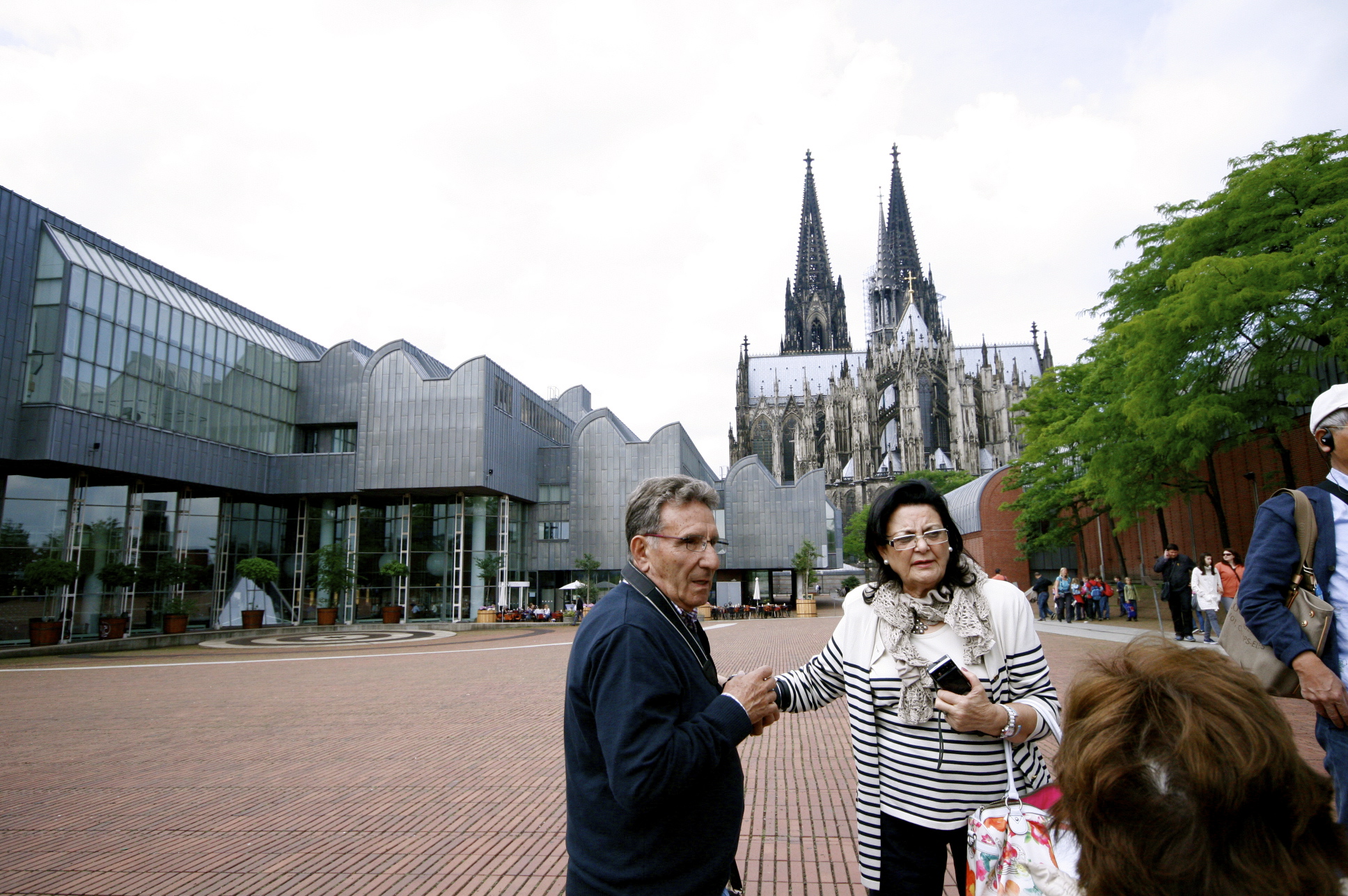 La expresión en sus rostros todavía demuestra que aún no se han recuperado de haber contemplado las imponentes bóvedas, las más altas del mundo, del gótico tardío de la catedral de Colonia, cuando ya la doctrina de la Reforma de Lutero se hacía eco entre los portentosos pilares de la catedral, bajo las dos torres de agujas que señalan al cielo como dos brazos victoriosos de un atleta, que han delatado al mito y al vicio de un Cristianismo materialista y sectario, y haber separado el camino de la razón de la fe del sendero de la fe de la razón. A ninguno de nosotros nos escandaliza que la modernidad de la construcción en la plaza conviva con el buen gusto de otra época. Nadie sensato en Alemania habría juzgado como un disparate el hecho de engarzar dos épocas distantes y diferentes: ni el pasado obstaculiza las nuevas tendencias, ni el presente tiene por qué denostar de la belleza rancia, siempre que se hayan observado los valores de la estética emérita.